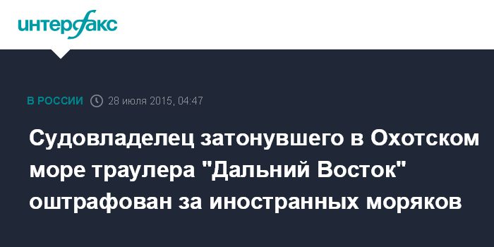 Москва. 28 июля. INTERFAX.RU - Судовладелец траулера БАТМ "Дальний Восток", затонувшего в Охотском море 2 апреля, оштрафован на 6 млн 250 тыс. рублей за незаконное привлечение иностранных граждан к работе, сообщает пресс-служба прокуратуры Сахалинской области.