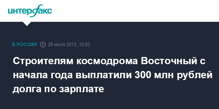 Москва. 28 июля. INTERFAX.RU - Общая сумма долга по зарплате, выплаченного строителям космодрома Восточный с начала года, составила почти 300 млн рублей, сообщила начальник управления по надзору за исполнением федерального законодательства прокуратуры Амурской области Ирина Маловичко.