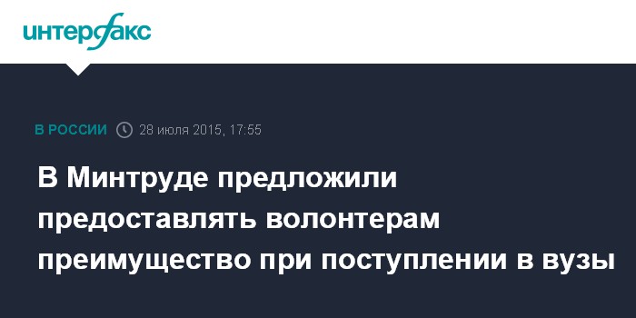 Москва. 28 июля. INTERFAX.RU - Минтруд подготовил законопроект, предусматривающий предоставлять волонтерам, которые были задействованы не менее 105 часов в сфере социального обслуживания, преимущество при зачислении в вузы по программам бакалавриата по социальной педагогике и социальной психологии.