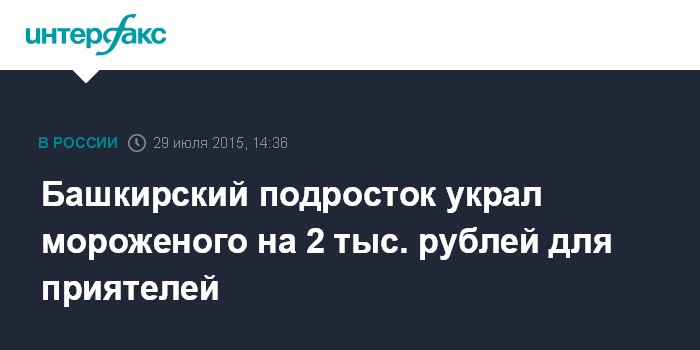 Москва. 29 июля. INTERFAX.RU - Школьник из Белорецка в Башкирии подозревается в краже мороженого на сумму более 2 тыс. рублей, сообщила пресс-служба МВД по республике в среду.