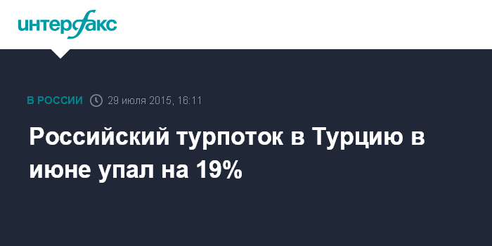 За шесть месяцев 2015 года в Турции побывало 14,9 млн иностранцев, что на 2,2% меньше прошлогоднего результата. Турпоток из России за это время упал на 24,3%: если в первом полугодии 2014 года в Турцию на отдых отправилось 1,92 млн россиян, то за январь-июнь 2015 года их число составило 1,45 млн.