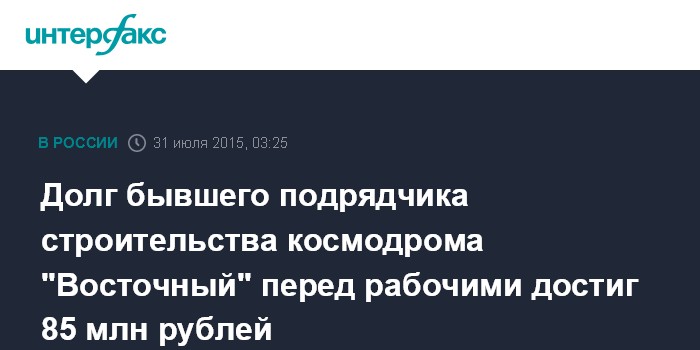Долг бывшего подрядчика строительства космодрома "Восточный" перед рабочими достиг 85 млн рублей