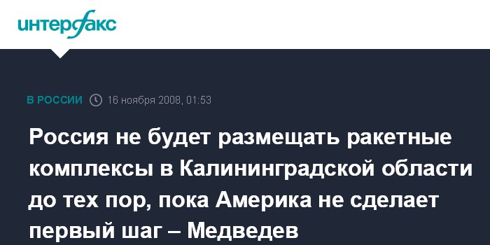 Вашингтон. 16 ноября. ИНТЕРФАКС - Президент РФ Дмитрий Медведев заявляет, что Россия не намерена предпринимать контрмеры до тех пор, пока Америка не сделает первый шаг по размещению элементов ПРО в Европе.