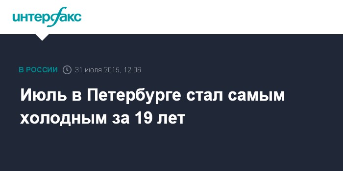 Москва. 31 июля. INTERFAX.RU - Второй месяц лета в Петербурге стал одним из самых холодных за историю наблюдений, показав среднюю температуру в 16,9 градуса, сообщил "Интерфаксу" главный синоптик северной столицы Александр Колесов в пятницу.