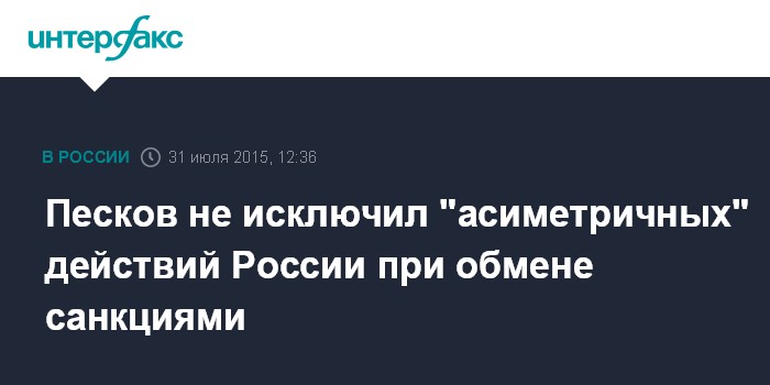 Москва. 31 июля. INTERFAX.RU - Россия будет исходить из принципов взаимности в отношении стран, вводящих против нее санкции, однако не исключает и асимметричного ответа, заявил в пятницу пресс-секретарь президента России Дмитрий Песков.