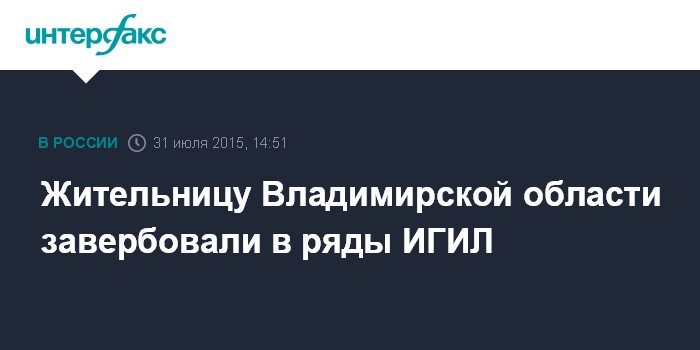 Москва. 31 июля. INTERFAX.RU - Жительница Владимирской области была завербована в ряды "Исламского государства", по этому факту возбуждено уголовное дело, сообщил прокурор Владимирской области Игорь Пантюшин.