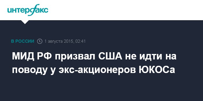 "Из ответной ноты МИД РФ посольству США явственно следует, что российская сторона не согласна с претензиями бывших акционеров ЮКОСа. Решение арбитража в Гааге Россия считает "неправосудным" и "политически ангажированным актом", который вынесен с "явным нарушением применимых правовых норм" и "несовместим с идеями верховенства права, независимого, беспристрастного и профессионального международного правосудия", - говорится в статье "Коммерсанта".