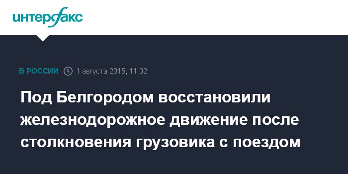 Москва. 1 августа. INTERFAX.RU - Железнодорожное движение восстановлено после столкновения КАМАЗа с поездом в Белгородской области, сообщает пресс-служба РЖД в субботу.