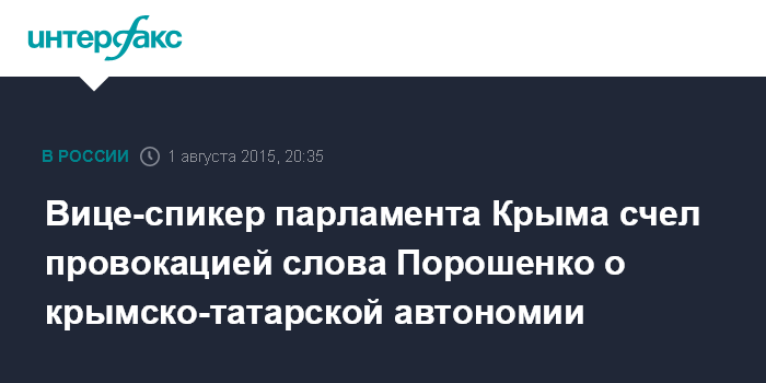 Москва. 1 августа. INTERFAX.RU - Обещание президента Украины Петра Порошенко создать в Крыму крымско-татарскую национальную автономию - это провокация с целью разжечь межэтнический конфликт в регионе, считает вице-спикер парламента республики Крым, глава движения "Къырм", объединяющего более 20 общественных и политических крымско-татарских организаций Ремзи Ильясов.