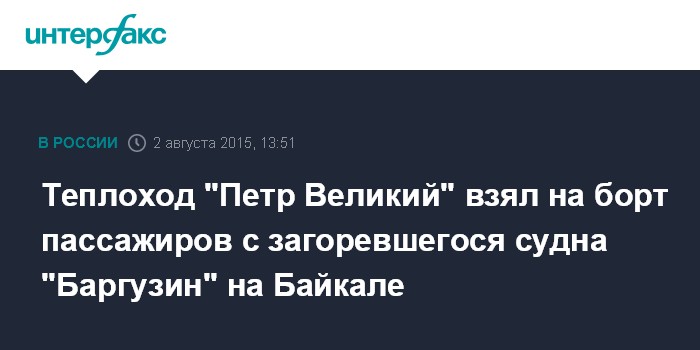 Москва. 2 августа. INTERFAX.RU - Пассажиры теплохода "Баргузин", который загорелся на озере Байкал, со спасательных плотов и шлюпок эвакуируются на подошедший к месту аварии теплоход "Петр Великий", сообщили "Интерфаксу" в пресс-службе ГУ МЧС по региону.