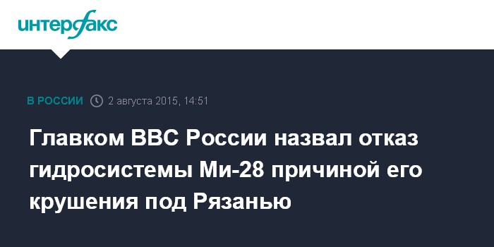 Москва. 2 августа. INTERFAX.RU - Причиной крушения вертолета Ми-28Н под Рязанью стал отказ гидросистемы, заявил журналистам в воскресенье главнокомандующий Военно-воздушными силами России генерал-полковник Виктор Бондарев.