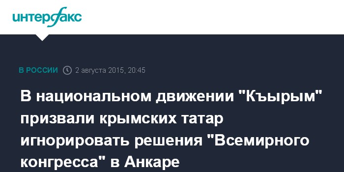Москва. 2 августа. INTERFAX.RU - Решения, принятые на так называемом Всемирном конгрессе крымских татар, который организован в Анкаре противниками воссоединения Крыма с Россией, деструктивны и идут во вред крымско-татарскому народу, считает лидер движения "Къырым", которое объединяет более 20 крымско-татарских общественных и политических организаций, Ремзи Ильясов.
