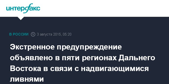 Москва. 3 августа. INTERFAX.RU - Спасатели распространили экстренное предупреждение о надвигающемся циклоне, под влияние которого попадут Приморский и Хабаровский края, Сахалинская, Амурская и Еврейская автономная области.