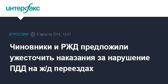 Москва. 3 августа. INTERFAX.RU - Региональные власти и ОАО "Российские железные дороги" предлагают ужесточить ответственность водителей за нарушение правил дорожного движения на ж/д переездах.