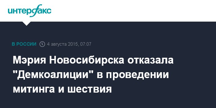 Москва. 4 августа. INTERFAX.RU - "Демократической коалиции" вновь отказано в проведении шествия и митинга в центре Новосибирска 11 августа, уведомление о котором было подано в мэрию Новосибирска.