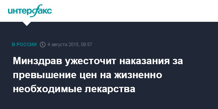 Москва. 4 августа. INTERFAX.RU - Минздрав РФ инициирует ужесточение наказания за превышение цен на лекарства, включенные в перечень жизненно необходимых и важнейших препаратов, сообщил во вторник "Интерфаксу" пресс-секретарь Минздрава РФ Олег Салагай.