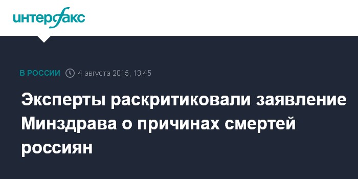 Накануне глава Минздрава Вероника Скворцова, находясь с визитом в Алтайском крае, признала, что рост смертности (по данным Росстата, на 2,3% за первое полугодие 2015 года в пересчете на тысячу населения) связан не со старением населения, о чем заявлялось ранее, а со случаями ухода из жизни людей в возрасте от 30 до 45 лет.