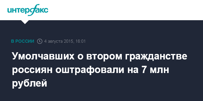 Москва. 4 августа. INTERFAX.RU - Штрафы на общую сумму почти 7 млн рублей взысканы с россиян, которые не предоставили информацию о втором гражданстве или о виде на жительство за рубежом, сообщили "Интерфаксу" во вторник в пресс-службе ФМС РФ.