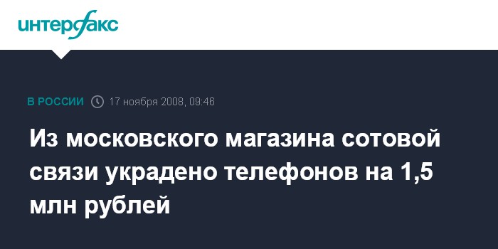 Москва. 17 ноября. INTERFAX.RU - На западе столицы в воскресенье вечером злоумышленники похитили из магазина сотовой связи телефоны на 1,5 млн рублей, сообщил "Интерфаксу" источник в правоохранительных органах города в понедельник.