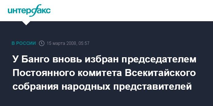 Пекин. 15 марта. ИНТЕРФАКС-КИТАЙ – У Банго переизбран председателем Постоянного комитета Всекитайского собрания народных представителей (ВСНП) на проходящей в Пекине сессии этого высшего органа государственной власти Китая.