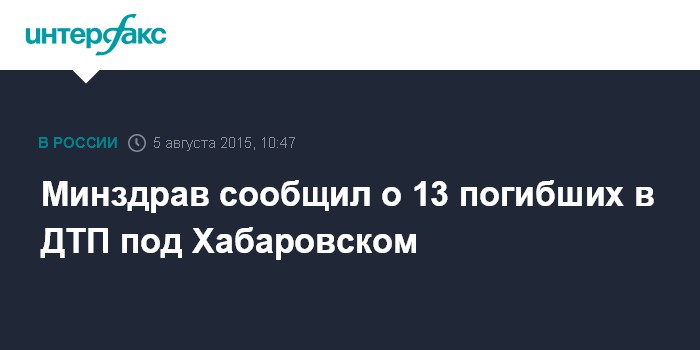Москва. 5 августа. INTERFAX.RU - Жертвами столкновения двух автобусов в Хабаровском крае стали 13 человек, 56 получили ранения, сообщил пресс-секретарь Минздрава РФ Олег Салагай.