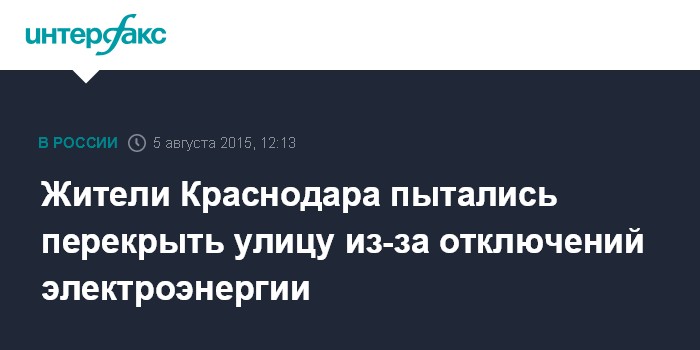 Москва. 5 августа. INTERFAX.RU - Аварийные отключения электроэнергии в Краснодаре, вызванные жарой, спровоцировали стихийную акцию жителей, которые накануне вечером пытались перекрыть движение по одной из городских улиц.