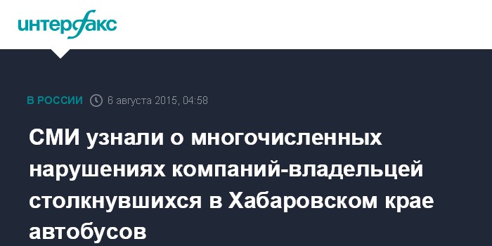 Москва. 6 августа. INTERFAX.RU - Компании-владельцы автобусов, столкнувшихся в Хабаровском крае, регулярно наказывали за нарушение правил перевозки и условий труда водителей, пишут в четверг "Известия".