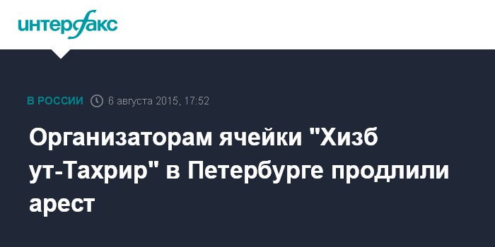 Москва. 6 августа. INTERFAX.RU - Суд Петербурга продлил арест ранее заключенных под стражу участников местной ячейки запрещенной в РФ международной террористической организации "Хизб ут-Тахрир аль-Ислами" ("Партия исламского освобождения"), сообщили "Интерфаксу" в пресс-службе УФСБ по региону в четверг.