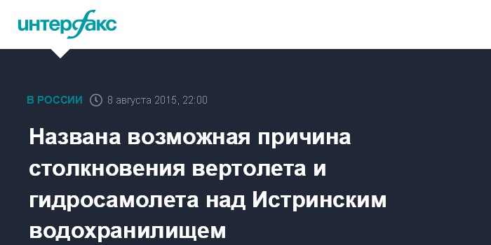 Москва. 8 августа. INTERFAX.RU - Причиной столкновения вертолета и гидросамолета над Истринским водохранилищем в Подмосковье могло стать нарушение правил полетов одним из пилотов, сообщил "Интерфаксу" источник в экстренных службах.