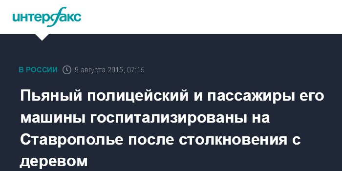 Москва. 9 августа. INTERFAX.RU - Служебная проверка проводится на Ставрополье по факту ДТП, в котором полицейский врезался в дерево, есть пострадавшие, сообщает пресс-служба краевого ГУ МВД.