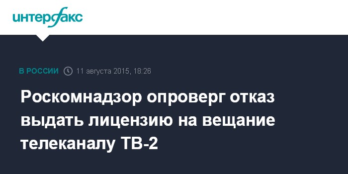 Ранее во вторник телеканал ТВ-2 сообщил об отказе Роскомнадзора в выдаче ему новой лицензии на вещание. В сообщении агентства ТВ-2, входящего в холдинг "Томская Медиа-Группа" говорилось, что "основанием послужило несоответствие поданных "Томской Медиа-Группой" документов требованиям закона Российской Федерации".