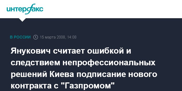Киев. 15 марта. ИНТЕРФАКС-УКРАИНА - Лидер украинской оппозиции, глава Партии регионов Виктор Янукович считает ошибочными подписанные договоренности между НАК "Нафтогаз Украины" и ОАО "Газпром" об условиях поставок газа.