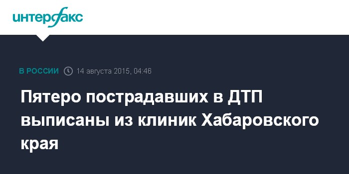 Москва. 14 августа. INTERFAX.RU - Пять человек из числа пострадавших в ДТП на трассе Хабаровск - Комсомольск-на-Амуре, в том числе трое детей, выписаны из больниц, сообщается в пятницу на сайте правительства региона.