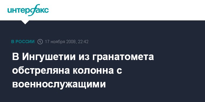 Назрань. 17 ноября. ИНТЕРФАКС-ЮГ - В станице Троицкой Сунженского района Ингушетии обстреляна из гранатомета колонна с военнослужащими.