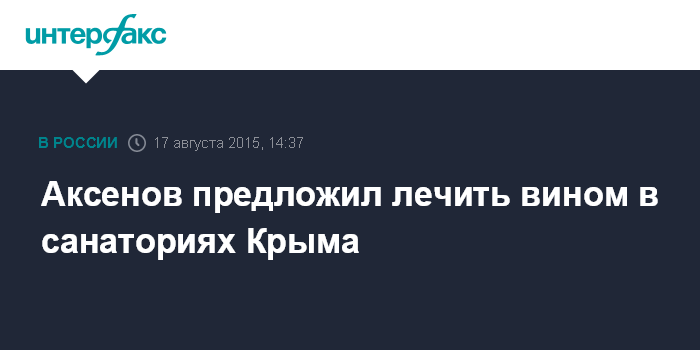 Москва. 17 августа. INTERFAX.RU - Глава Крыма Сергей Аксенов предлагает законодательно разрешить употребление вина в лечебных целях в российских санаториях.