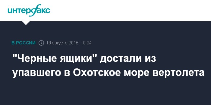 Москва. 18 августа. INTERFAX.RU - Бортовые самописцы изъяты с затонувшего в Охотском море вертолета Ми-8, сообщила "Интерфаксу" старший помощник руководителя Дальневосточного следственного управления СКР на транспорте Оксана Полшакова.