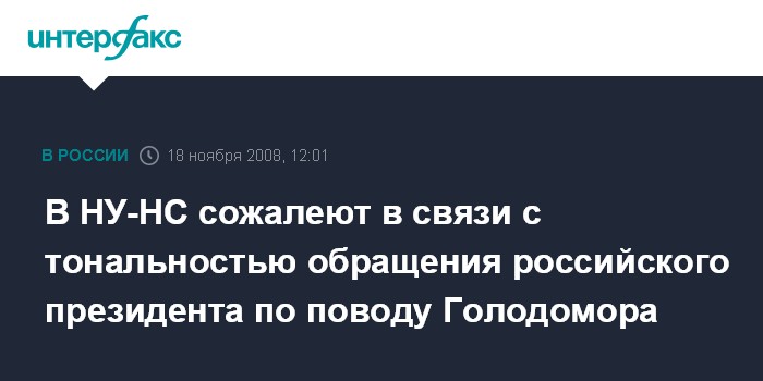 Москва. 18 ноября. INTERFAX.RU - Во фракции блока "Наша Украина - Народная самооборона" (НУ-НС) считают, что тональность обращения президента России Дмитрия Медведева к украинскому коллеге Виктору Ющенко по поводу 75-й годовщины Голодомора 1932-1933 годов не способствует укреплению украинско-российских отношений.