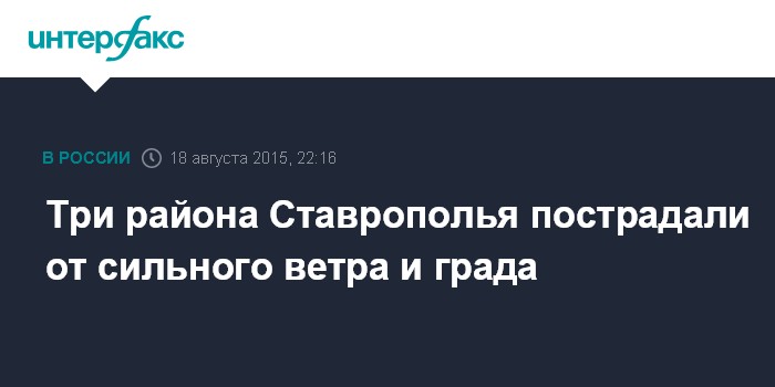 Москва. 18 августа. INTERFAX.RU - Три района Ставропольского края, Благодарненский, Апанасенковский и Новоселицкий, пострадали от сильного дождя, ветра и града, сообщил "Интерфаксу" глава пресс-службы ГУ МЧС по региону Олег Дегтярев.