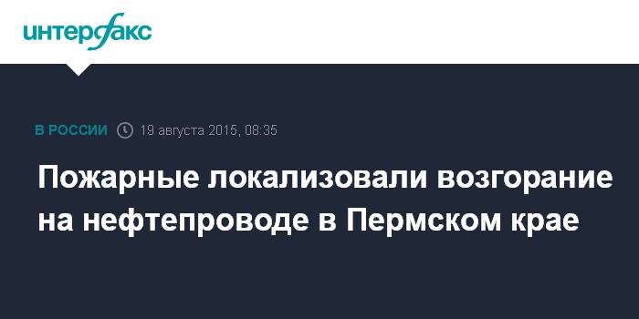 Москва. 19 августа. INTERFAX.RU - Пожар на нефтепроводе в Пермском крае локализован, сообщает пресс-служба регионального ГУ МЧС в среду.