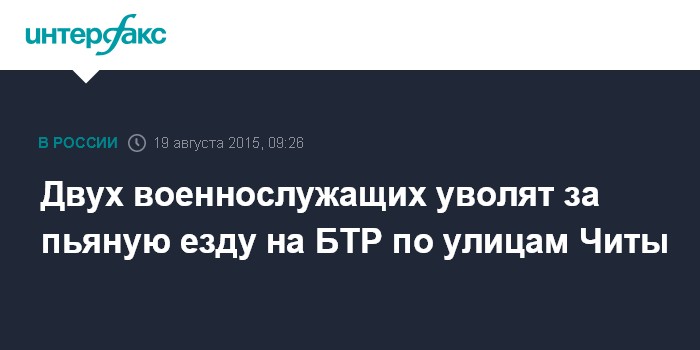 Москва. 19 августа. INTERFAX.RU - Военнослужащих, которые в пьяном виде разъезжали на БТР по улицам Читы, уволят с военной службы, сообщает пресс-служба Восточного военного округа.