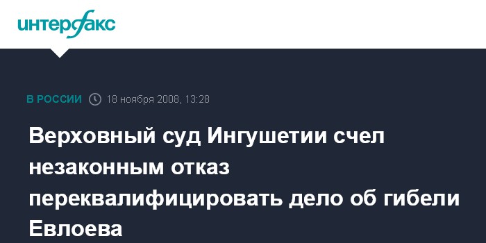 Москва. 18 ноября. INTERFAX.RU - Верховный суд Ингушетии признал незаконным отказ районного суда республики переквалифицировать уголовное дело по факту гибели владельца сайта "Ингушетия.ру" Магомеда Евлоева со статьи "Причинение смерти по неосторожности" на "Убийство". "Верховный суд республики решил, что суд первой инстанции вынес незаконное решение и отменил постановление, которым нам было отказано переквалификация уголовного дела о гибели Магомеда Евлоева", - сообщил "Интерфаксу" во вторник адвокат семьи Евлоевых Муса Плиев.