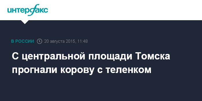 Москва. 20 августа. INTERFAX.RU - Сотрудники полиции прогнали корову с теленком, которые вышли на проезжую часть центральной площади Томска, сообщили агентству "Интерфакс" в пресс-службе УМВД по региону в четверг.