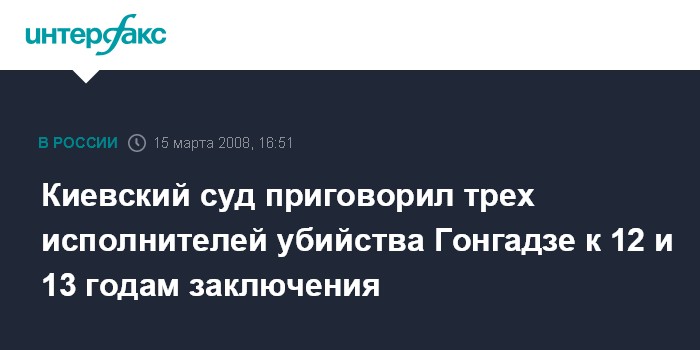 Киев. 15 марта. ИНТЕРФАКС-УКРАИНА - Апелляционный суд Киев приговорил трех исполнителей убийства журналиста Георгия Гонгадзе - Николая Протасова, Валерия Костенко и Александра Поповича - к 13-ти, 12-ти и 12-ти годам лишения свободы соответственно.