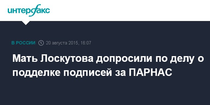 Москва. 20 августа. INTERFAX.RU - Мать идеолога новосибирской "Монстрации" и кандидата от ПАРНАСа на выборах в новосибирский парламент Артема Лоскутова допросили по делу о фальсификации подписей за "Демкоалицию".