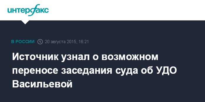Москва. 20 августа. INTERFAX.RU - Рассмотрение ходатайства об условно-досрочном освобождении (УДО) экс-чиновницы Минобороны РФ Евгении Васильевой, назначенное в суде во Владимирской области на 21 августа, скорее всего, будет перенесено на другой день, сообщил "Интерфаксу" информированный источник.