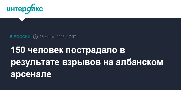 Лондон. 15 марта. ИНТЕРФАКС - Мощные взрывы гремят в субботу на военных складах близ албанской столицы Тираны, пострадали не менее 150 человек, передает Би-би-си, ссылаясь на местные власти.
