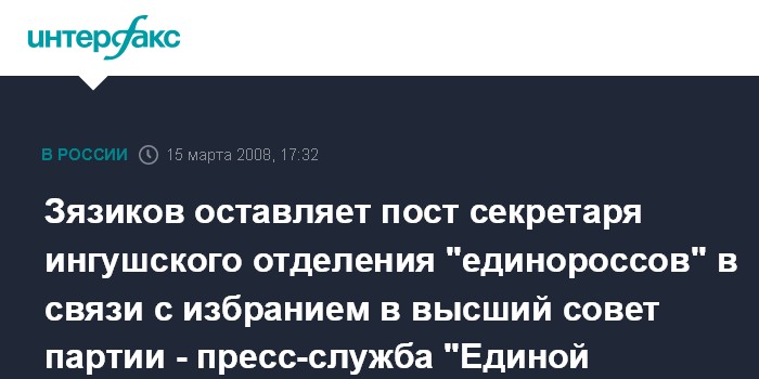Зязиков оставляет пост секретаря ингушского отделения "единороссов" в связи с избранием в высший совет партии - пресс-служба "Единой России"
