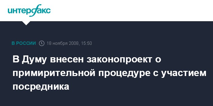Москва. 18 ноября. INTERFAX.RU - Законопроект "О примирительной процедуре с участием посредника (медиации)", предусматривающий разрешение споров хозяйствующих субъектов с помощью посредников, через примирение сторон, внесен во вторник в Государственную Думу.
