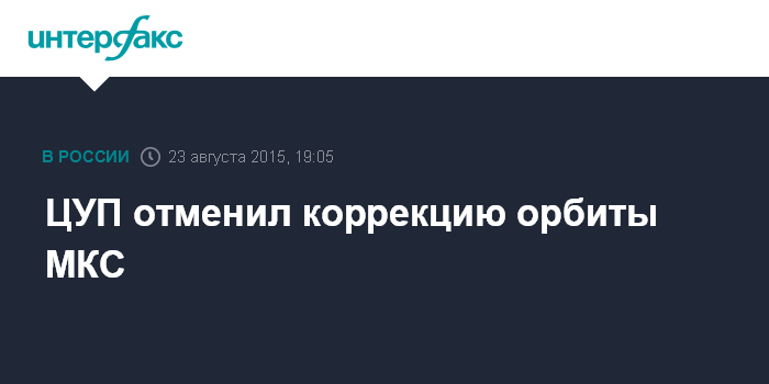 Москва. 23 августа. INTERFAX.RU - Центр управления полетами (ЦУП) отменил намеченную на 24 августа коррекцию орбиты Международной космической станции (МКС), сообщили "Интерфаксу-АВН" в Роскосмосе.