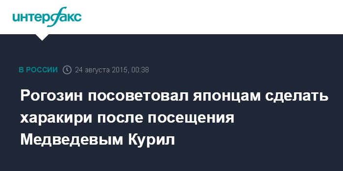 Москва. 24 августа. INTERFAX.RU - Вице-премьер РФ Дмитрий Рогозин порекомендовал японцам, переживающим из-за поездки на Курилы Дмитрия Медведева, сделать харакири. Об этом он написал в своем твиттере.